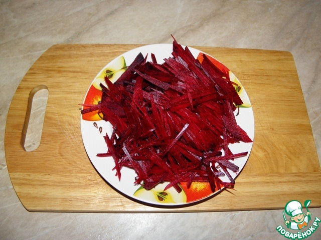 Сразу займемся свеклой: Свеклу нарезаем соломкой толщиной до 5 миллиметров и длиной до 4 – 5 сантиметров. (я использовала терку для корейской моркови)