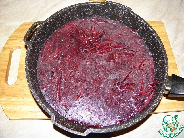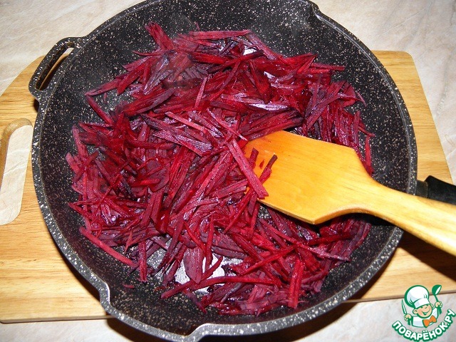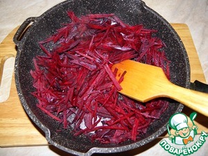 Разогреваем сковороду с топленым салом (я использовала растительное масло) и обжариваем свеклу в течении 12 минут