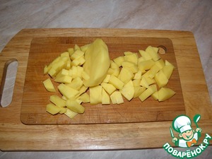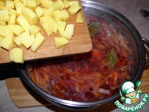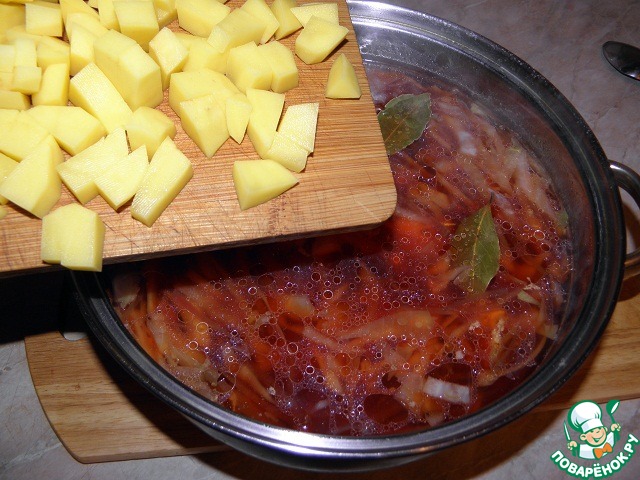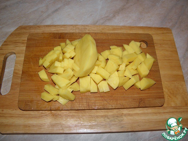 Пока тушится свекла подготавливаем другие овощи: картофель режем кубиками (помещаем в холодную воду)