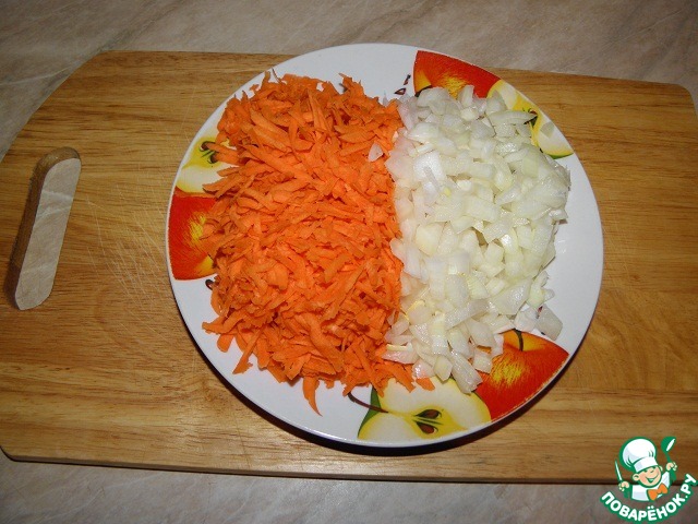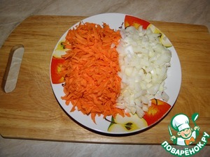 Делаем зажарку: лук режем кубиком, морковку трем на крупной терке