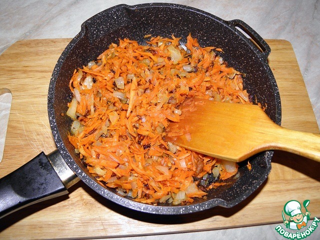 В сковороду к салу добавляем сначала лук, затем морковь, обжариваем