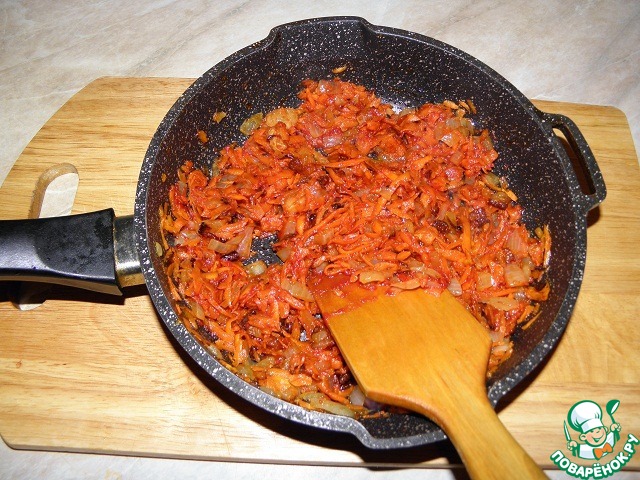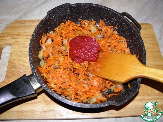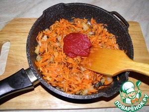 Затем к луку с морковью добавляем томат пасту (или помидоры)