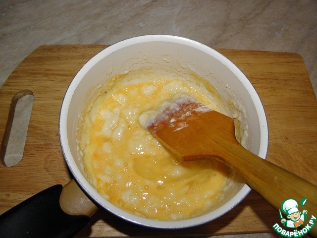 Затем снять с плиты, дать остыть до комнатной температуры, вбить яйцо и хорошо перемешать