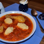 Разложить борщ по тарелкам, на каждую порцию положить приблизительно по 4-6 галушек