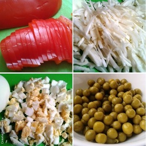 Смешать все ингредиенты - капусту, перец, яйца, зеленый горошек, петрушку.