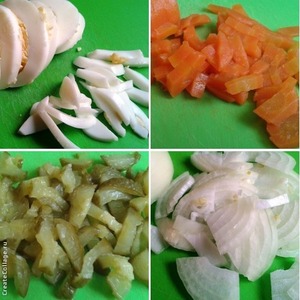 Яйца, морковь (у меня вареная) и огурец нарезать соломкой (или кубиками). Если у вас морковь сырая, то натрите её на крупной терке.