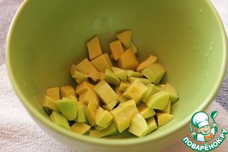 Авокадо очистить от кожуры, удалить косточку, нарезать мякоть кубиками и сбрызнуть лимонным соком.