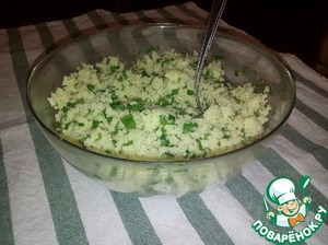 Делаем кускус. На 1 стакан крупы - 2 стакана кипятка. Даём настояться, пока вода полностью не впитается. Готовую крупу солим, я добавляю паприку, иногда тимьян. Зелень рубим мелко-мелко, добавляем.