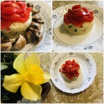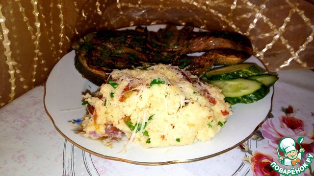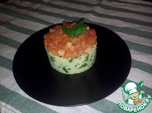 Формируем гарнир. Снизу кускус, сверху томат. У меня для этого есть специальные формочки. Можно использовать подручные средства, тут уже Ваша фантазия:) Можно просто смешать кускус и томат, будет сочно.