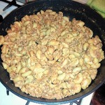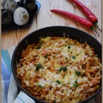 Дальше вливаем в сковородку стакан воды, мешая, доводим до кипения и засыпаем макароны, ставим на медленный огонь, закрываем крышкой и, периодически перемешивая, доводим до полной готовности макарон (время зависит от сорта макаронных изделий).