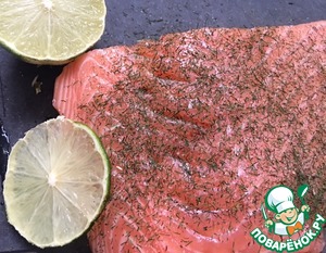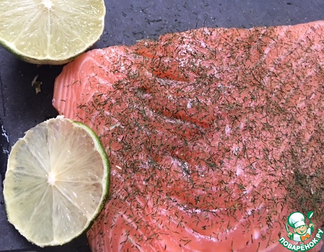 Посолите и присыпьте сушеным укропом. Обжарьте. В процессе обжаривания, полейте соком лайма и периодически поливайте образовавшимся соком сам кусочек рыбы.