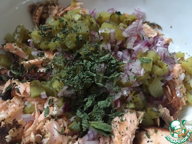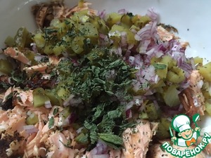 Нарежьте мелко лук и огурчики и добавьте к лососю.