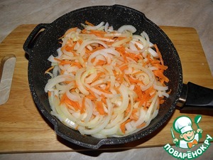 На другой сковороде обжарить на растительном масле лук с морковью до золотистого цвета.