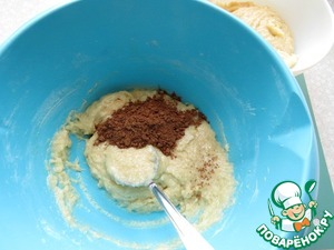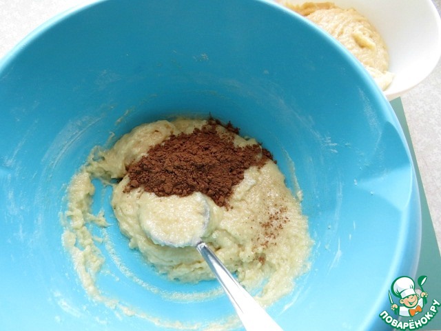 Делим тесто на две части и в одну часть добавляем какао-порошок.