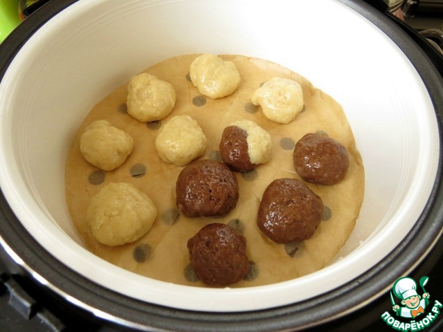 Так как у меня в пароварке большие дырочки, я её застелила бумагой для выпечки, предварительно разрезав (на фото видно). Мокрыми руками из теста формуем шарики и укладываем в пароварку. Устанавливаем программу "Варка на пару", время 30 минут.