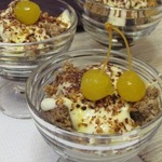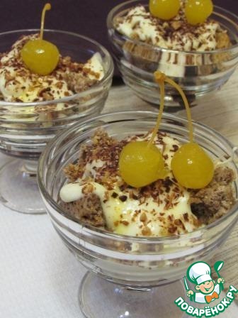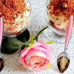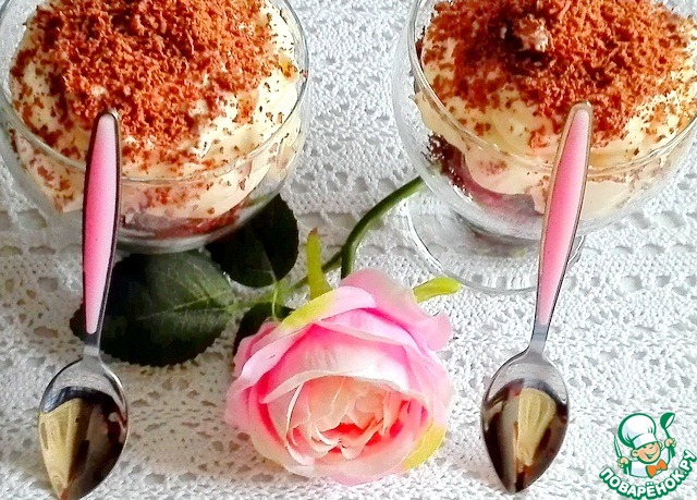 Можно пряники горкой выложить на блюдо, каждый слой заливая взбитыми сливками. Я взяла порционные креманки, наполнила их пряниками, залила взбитыми сливками, посыпала тёртым шоколадом и украсила малинкой и мятой.