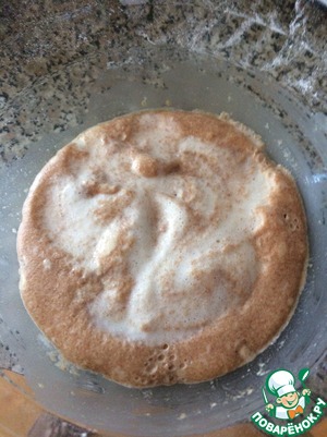 Приготовить опару: в тёплом молоке растворить дрожжи, добавить столовую ложку муки и сахар. Накрыть полотенчиком и поставить в тёплое место на 15-20 минут. Вот такая шапочка образуется.