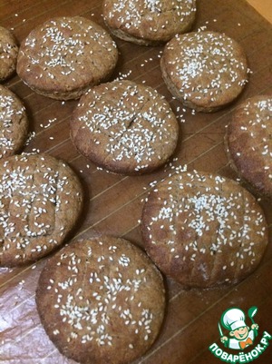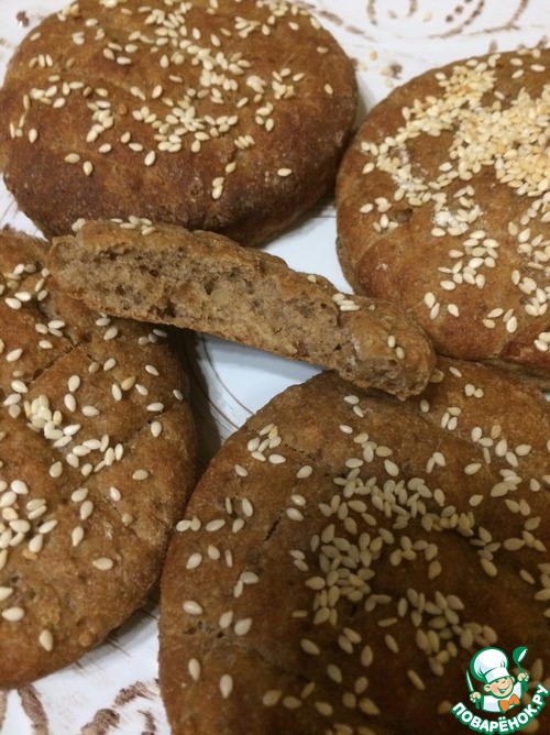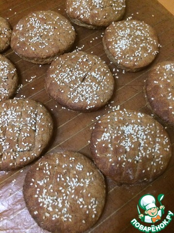 Духовку разогреть до 200 градусов. Раскатать пласт толщиной 1 см, вырезать хлебцы. Ножом сделать насечку крест - накрест. Сбрызнуть лепёшечки водой и посыпать кунжутом, но это не обязательная опция - я иногда делаю, иногда - нет. Выложить хлебцы на противень, застеленный ковриком или бумагой. Выпекать 20 мин до золотистого цвета. Вынуть, переложить остывать на решётку.