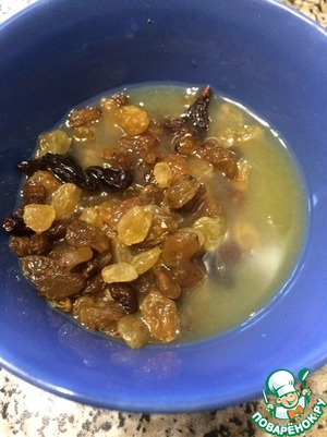 Залить соком, вымытый и просушенный бумажным полотенцем, изюм.