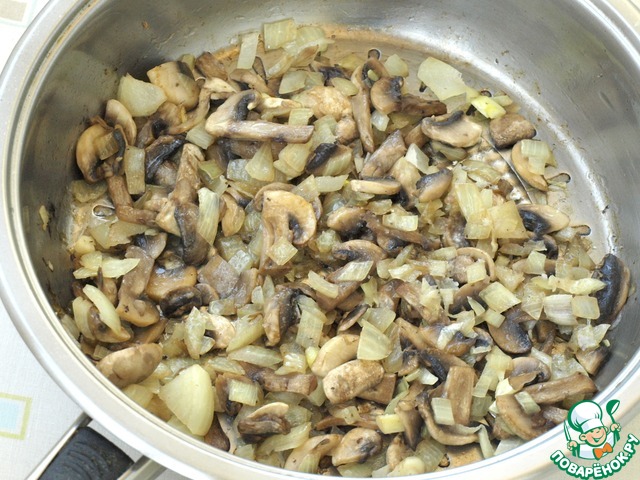 Шампиньоны промыть и нарезать пластинками. Лук почистить и нарезать кубиками. Разогреть в сковороде масло и обжарить лук с грибами совсем немного, в конце посолить и поперчить.
