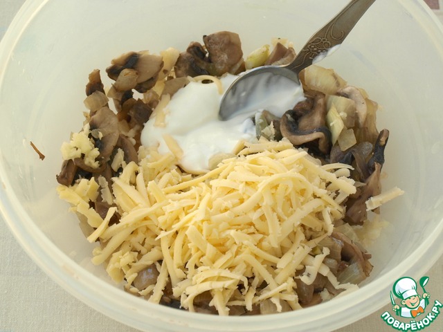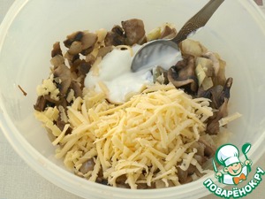 Когда грибы остынут, переложить их в миску и добавить сметану и половину натёртого сыра.