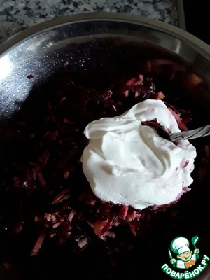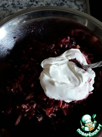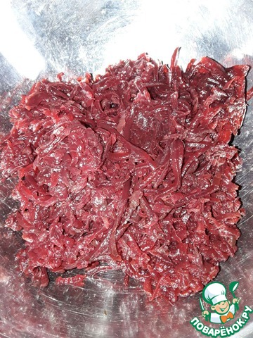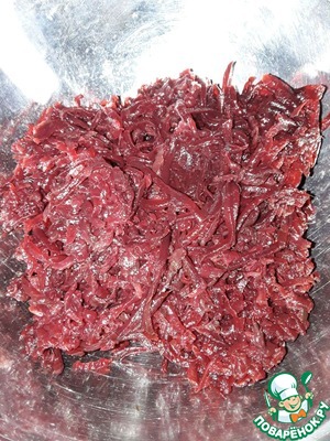 Отварить свеклу, почистить и натереть на крупной терке. Я брала уже готовую, отварную свеклу.