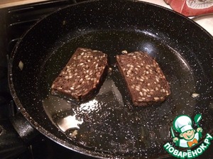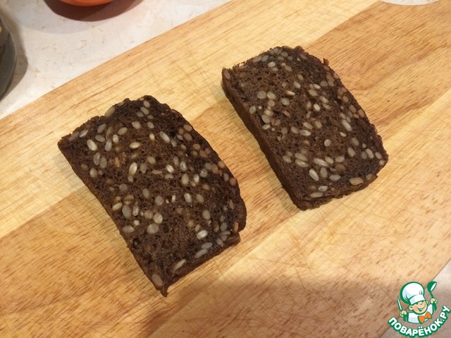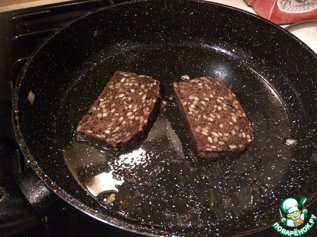 1. Берем два ломтика хлеба и обжариваем их на оливковом масле, главное много не лить, так как хлеб впитывает в себя масло и получается слишком маслянисто) -