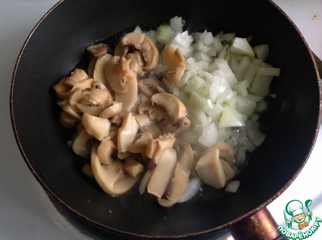 Лук нарезать мелким кубиком. С шампиньонов слить лишнюю жидкость, добавить к луку и обжарить в небольшом количестве растительного масла до золотистого цвета. Остудить.
