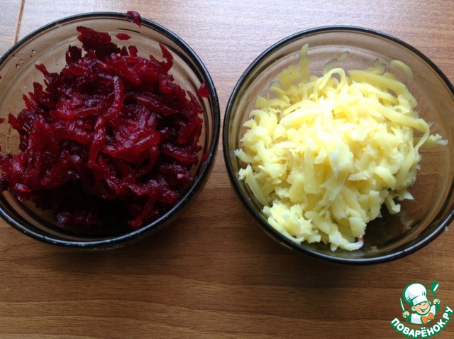 Картошку и свеклу очистить, натереть на крупной терке. Грецкий орех прокрутить в мясорубке или измельчить блендером.