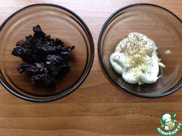 Чернослив нарезать маленьким кубиком. К майонезу добавить смесь молотых перцев и чеснок пропущенный через пресс, перемешать. Собрать салат слоями: