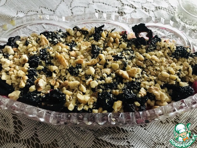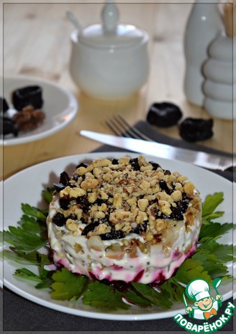 Вкусный, сочный, в меру пикантный салат с грибами и свеклой. Облагороженный орехами и черносливом салат не оставит вас равнодушными. Угощайтесь!!!