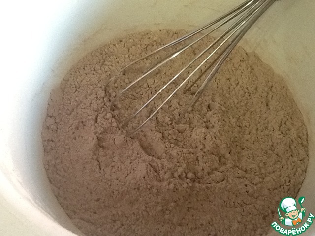 Подготовим сухую смесь - для этого надо просеять 350 г муки, 30 г какао и 2 ч. л. разрыхлителя.
