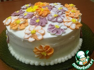 Ну и последний штрих - украшаем наш торт, просто выкладываем хаотично цветочки! Я по нижней кромке еще пустила ожерелье из крема :)