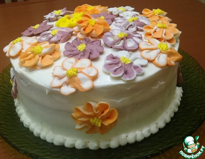 Через пару часов достаем и щедро покрываем еще слоем крема верх и бока. Так чтобы закрыть огрехи. Сверху будут цветочки, а вот бока неплохо б выровнять.