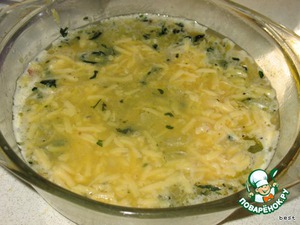 Вылить половину яичной смеси в форму (предварительно смазав маслом), выложить сверху кабачки с луком и залить оставшейся яичной смесью.
