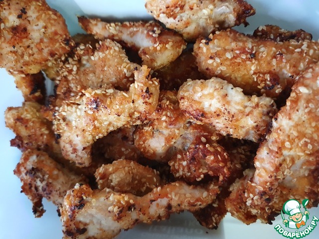 Основная мысль рецепта - быстро и вкусно. Куриное мясо обжаривается буквально по нескольку минут с каждой стороны. При таком способе приготовления очень уместно использовать заранее обжаренный кунжут. Такая мелочь сделает блюдо гораздо вкуснее.