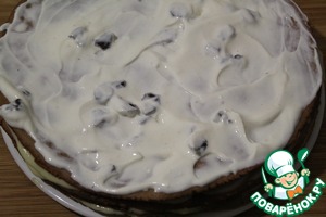 На них складываем, смазанные сметаной и посыпанные черносливом, 4 коржа. Немного сметанного крема оставить для боков.