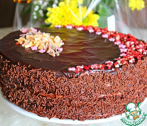 Снимаем груз и наносим глазурь на последний корж, обмазываем ей бока торта - лучше делать на подставке и вниз подставить тарелку - глазурь будет на нее стекать. Глазурь на корже разровнять горячим ножом.