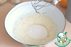 Отделить белки от желтков. Взбить белки в пену. Добавить сахар взбить вновь.