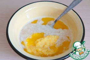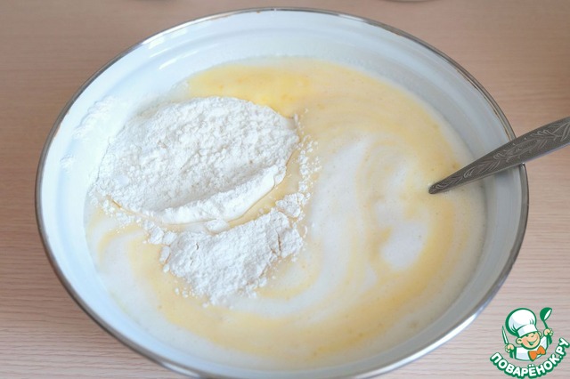 Муку (1,5 стакана) соединить с кукурузным крахмалом (2 ст. ложки), добавить 1/2 ч. ложки разрыхлителя. Смесь перемешать.
