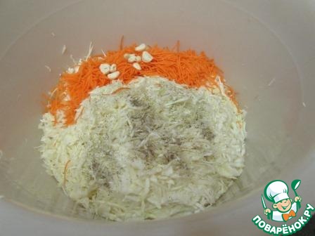 В принципе всё как обычно - капусту нашинковать удобным для Вас способом, морковь натереть на средней терке. Головку чеснока разобрать на зубочки и очистить. В широкую посуду переложить капусту, морковь, чеснок и черный молотый перец. Перемешать руками, но не мять.