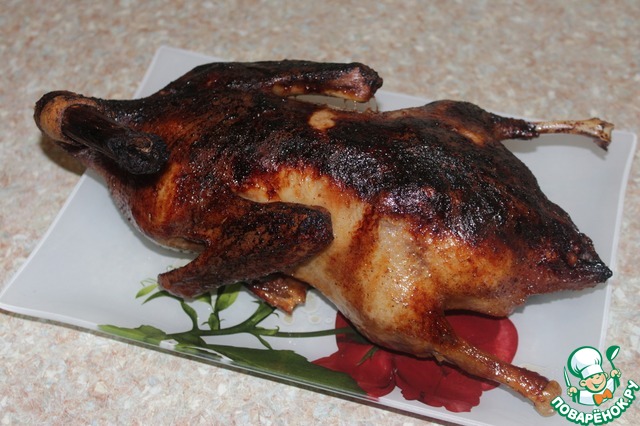 Достаем утку из духовки и поливаем небольшим количеством сиропа. Снова отправляем запекаться, но уже при 180 градусах. Повторяем так несколько раз, пока не закончится глазурь в течение 1,5 часов. Я немного позабыла о моей красавице, т. к набежали гости, она у меня чуточку зарумянилась.