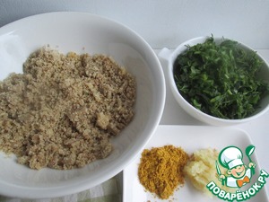 В это время займемся приготовлением ореховой заправки. Измельчаем грецкие орехи. Чеснок выдавливаем через пресс. Зелень мелко режем. Приправу "хмели-сунели", или другую, добавляйте по своему вкусу. Затем все продукты тщательно перемешиваем.