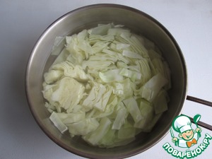Сотейник с водой поставить на плиту. Капусту нарезать произвольно и опустить в кипящую воду. Варить до мягкости, приблизительно 20 минут. Потом откинуть на дуршлаг, дать воде стечь и остудить.