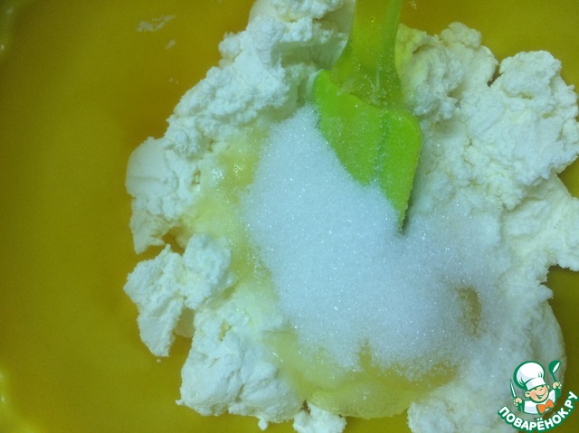 Добавть сахар, щепотку соли и на кончике ножа ванилин (у кого нет ванилина, можно использовать ванильный сахар, но тогда основное количество сахара снизить). И снова всё перемешать.