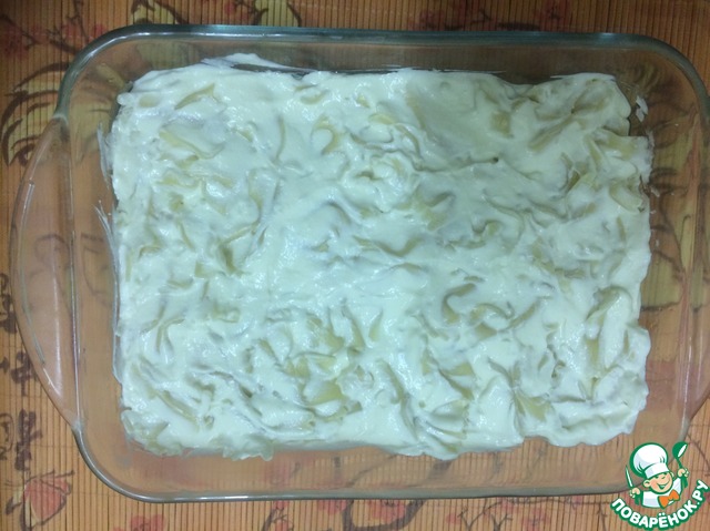 В неё равномерно выложить творожно-макаронную смесь, разровнять и поставить в духовку с температурой 180 градусов на 15-20 минут.