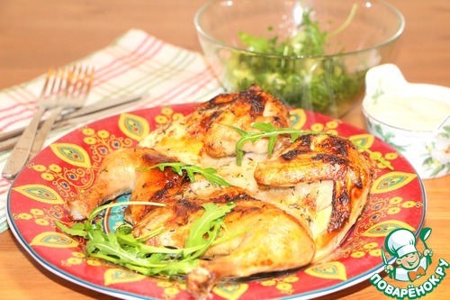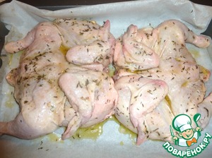• Цыплят разрезать пополам вдоль по грудке. Раскрыть тушки и распластать на рабочей поверхности с силой придавив рукой (как на цыпленка тапака). Если готовите большую курицу, то просто порежьте ее на куски. Или разделайте также.
