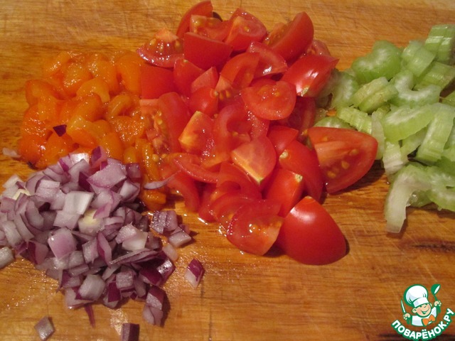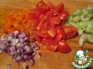 Порезать мелко сельдерей, лук, помидоры нарезать четвертинками или восьмушками, перец очистить от кожицы и нарезать кубиками.