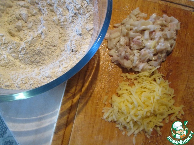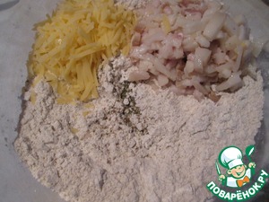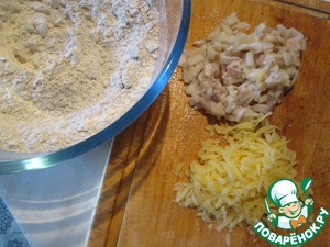 Духовку разогреть до 190 градусов. Перемешать всю муку с разрыхлителем и солью. Сало мелко порезать, сыр натереть на крупной терке. Сало вполне можно заменить беконом.