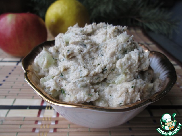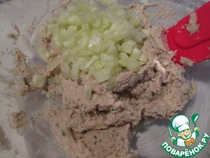 Очистите огурец, мелко нарежьте и смешайте с паштетом.